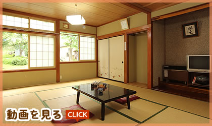 緑に囲まれ、四季折々の風景をお楽しみいただける和室となっています。 落ち着いた静かな空間でのんびりとお寛ぎください。 窓の外を見ると、小さく見える看板・・・そう、お隣は戸隠スキー場! 滑ったまま宿に帰れるほどゲレンデが近いので、冬の季節はスキーのお客様に大好評です。
