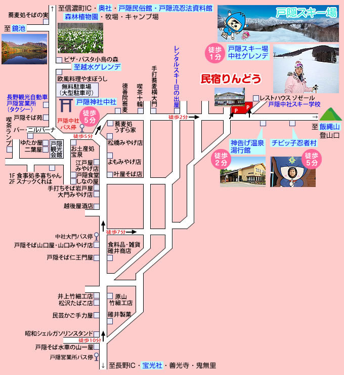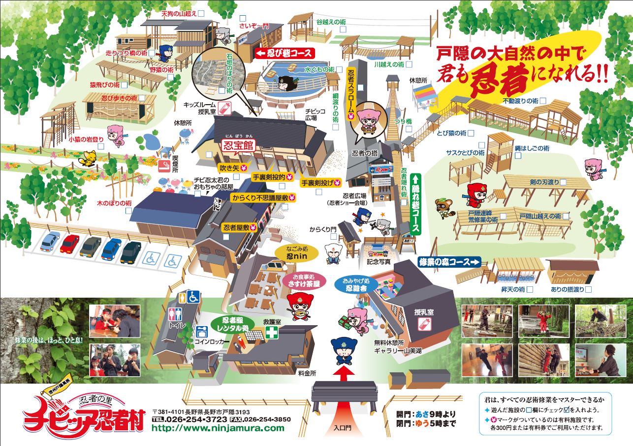 りんどうから徒歩5分、チビッ子忍者村は戸隠流忍者をテーマにしたアミューズメントパーク! 子供から大人まで楽しめるさまざまな施設がいっぱいあります。 また、時期に応じたさまざまなイベントも開催されています。